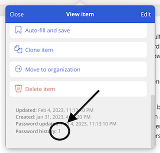 - Scroll to the bottom of the vault entry to find, in small font, “Password history” and click the number (probably